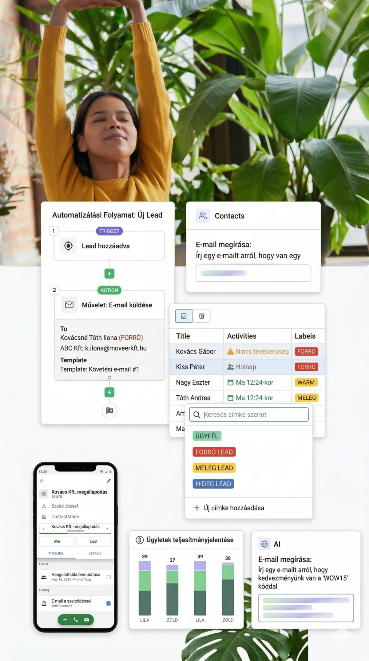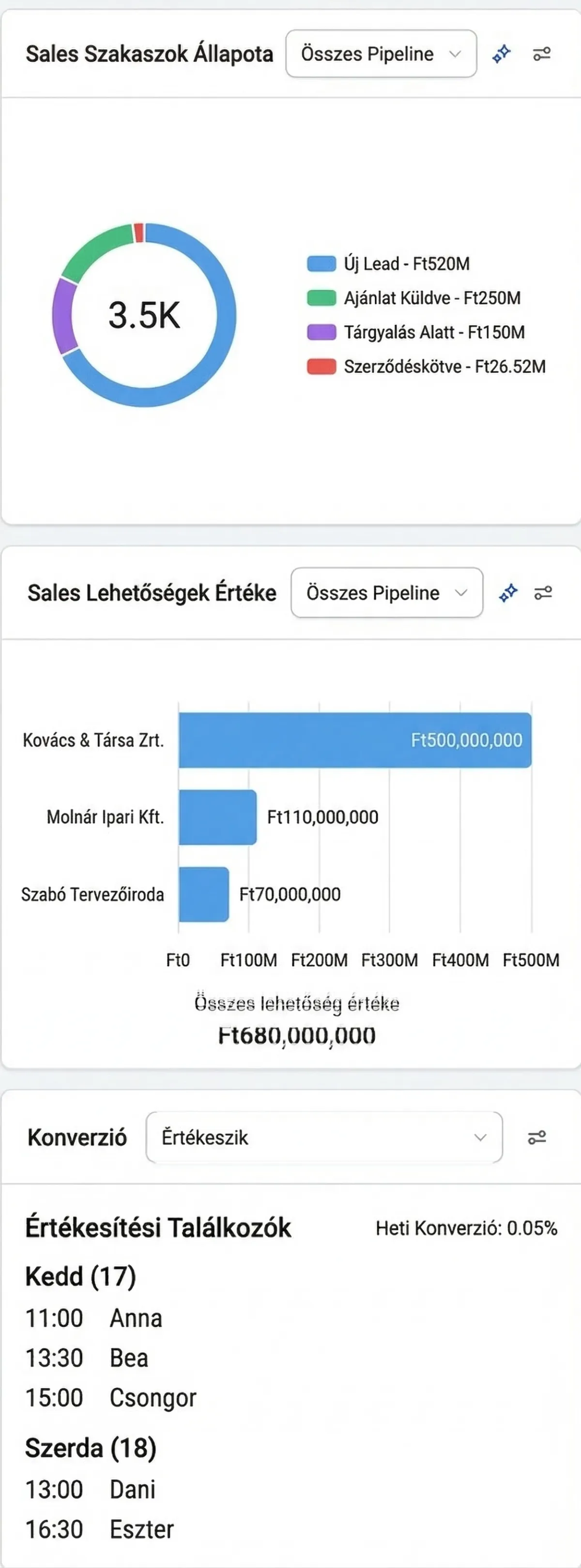 Egyetlen központi agy, ahol minden email, hívás, ajánlat és fizetés magától a helyére kerül. Az adminisztráció 80%-át a rendszer végzi el helyetted: státuszt vált, emlékeztet, számláz.